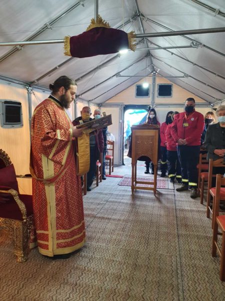 Στο κήρυγμά του, ο κ. Θεόκλητος ευχαρίστησε θερμά όλους όσοι συνέβαλαν ώστε να στηθεί ο πρόχειρος αυτός Ναός, αρχής γενομένης από τον Αντιπεριφερειάρχη της περιφερειακής ενότητας Τρικάλων κ. Χρήστο Μιχαλάκη, ο οποίος και ήταν παρών. Επίσης, ευγνωμόνως απευθύνθηκε στα μέλη των εθελοντών της πολιτικής προστασίας από τον Ν. Λάρισας, τα οποία και συμμετείχαν στην θεία Λειτουργία, η συμβολή των οποίων ήταν ουσιώδης και καθοριστική.