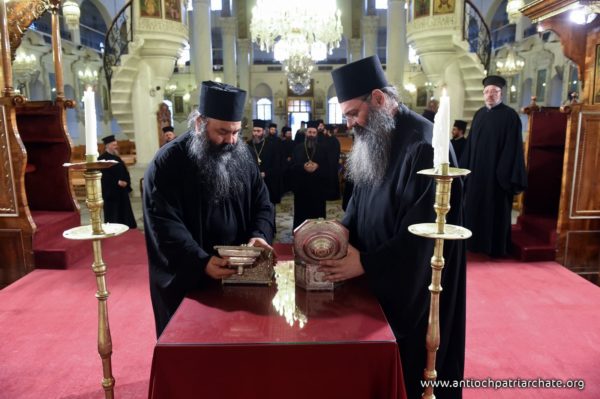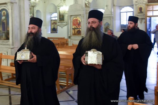 Ὁ Σεβ. Μητροπολίτης Σταγῶν καὶ Μετεώρων κ. Θεόκλητος μαζὶ μὲ τοὺς Ἡγουμένους τῶν ἀνδρικῶν Ἱερῶν Μονῶν τῶν Ἁγίων Μετεώρων καὶ τινὲς Πατέρες, κατόπιν προσκλήσεως τοῦ Μακ. Πατριάρχου Ἀντιοχείας καὶ πάσης Ἀνατολῆς κ. Ἰ ω ά ν ν ο υ, ἀπὸ 22 ἕως 30 Αὐγούστου, μετέφεραν εἰς τὸν Λίβανον καὶ τὴν Συρίαν τὴν ἀριστερὰν ἄφθορον χεῖρα τοῦ Ἁγίου Ἰωάννου τοῦ Χρυσοστόμου, ἡ ὁποία θησαυρίζεται στὴν Ἱερὰ Μονὴ Βαρλαὰμ Μετεώρων, καθὼς καὶ ἀπότμημα τῆς τιμίας Κάρας τοῦ Ἁγίου Μεγαλομάρτυρος Παντελεήμονος, τὸ ὁποῖον φυλάσσεται στὴν Ἱερὰ Μονὴ τοῦ Μεγάλου Μετεώρου, πρὸς εὐλογία, ἐνίσχυση καὶ ἐνδυνάμωση τῶν ἀδελφῶν μας ὀρθοδόξων χριστιανῶν τῶν δύο αὐτῶν χωρῶν, ποιμνίου τοῦ Πατριαρχείου Ἀντιοχείας.