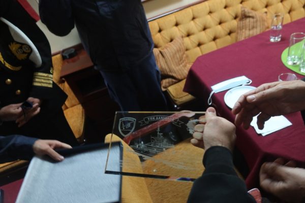 Στη συνέχεια, ο Σεβασμιώτατος κ. Δωρόθεος Β’ έπλευσε στην ιερά νήσο Τήνο για υπηρεσιακούς λόγους και, άμα τη επιστροφή του, το απόγευμα, επεσκέφθη εθιμοτυπικά την ελλιμενισμένη στην προβλήτα του λιμένος Ερμουπόλεως ΤΠΚ «ΔΑΝΙΟΛΟΣ», συνοδευόμενος από τον Λιμενάρχη Σύρου και ευχήθηκε στον κυβερνήτη, στον επιβαίνοντα αυτής Διοικητή Ταχέων Σκαφών και το πλήρωμα για τις εορτές των Χριστουγέννων.