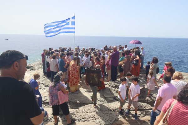 Ακολούθως, μετέβη στην επί του ακρότατου σημείου του ιερού Βράχου κειμένη φιάλη, προπορευομένων των αγίων Εικόνων της Παναγίας Χρυσοπηγής και της Αναλήψεως, όπου τέλεσε τον, κατά το έθος, Αγιασμό