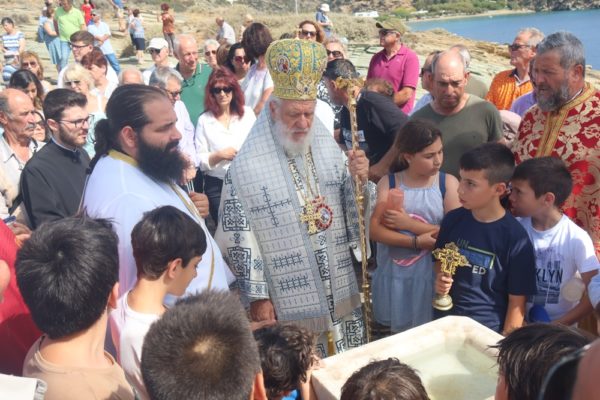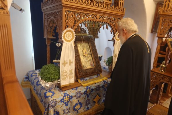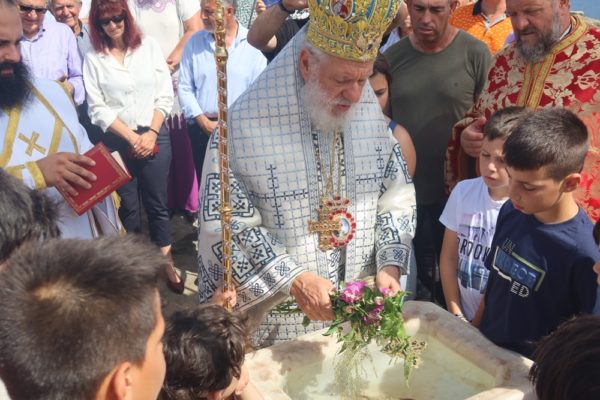 Ακολούθως, μετέβη στην επί του ακρότατου σημείου του ιερού Βράχου κειμένη φιάλη, προπορευομένων των αγίων Εικόνων της Παναγίας Χρυσοπηγής και της Αναλήψεως, όπου τέλεσε τον, κατά το έθος, Αγιασμό