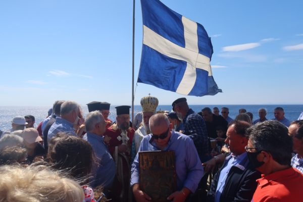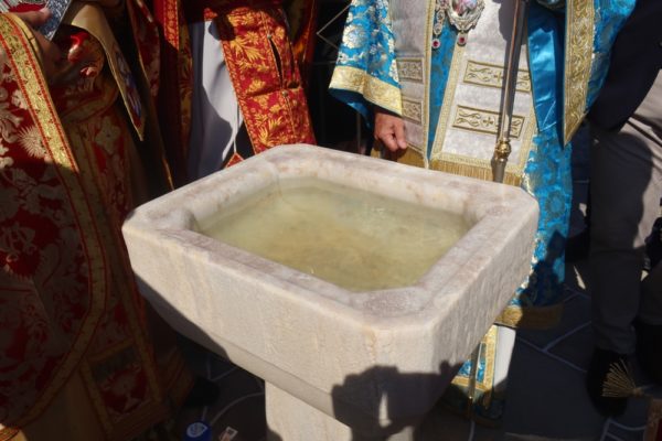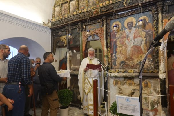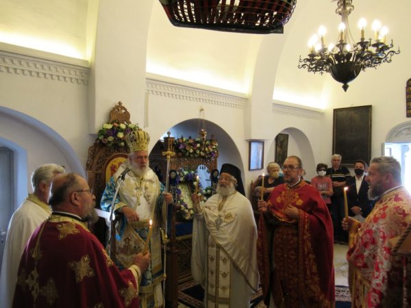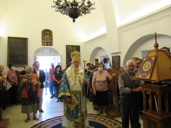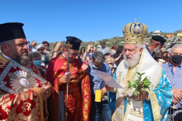 Ακολούθως, μετέβη στην επί του ακρότατου σημείου του ιερού Βράχου κειμένη φιάλη, όπου ετέλεσε τον Αγιασμό και ανέπεμψε ευχαριστήρια και ικετήρια δέηση υπέρ υγείας των πιστών και πλήρη καταστολή της πανδημίας.