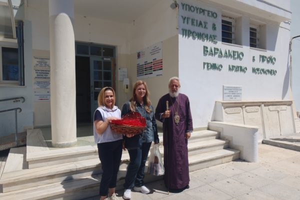 Στη συνέχεια, ο Σεβασμιώτατος κ. Δωρόθεος Β’, μετέβη στο Βαρδάκειο και Πρώιο Νοσοκομείο Σύρου, συνοδευόμενος από την Πρόεδρο των εργαζομένων, και προσέφερε πασχάλια αυγά και αναστασιμες ευχές στους εργαζόμενους και περιθαλπομένους σ’ αυτό.