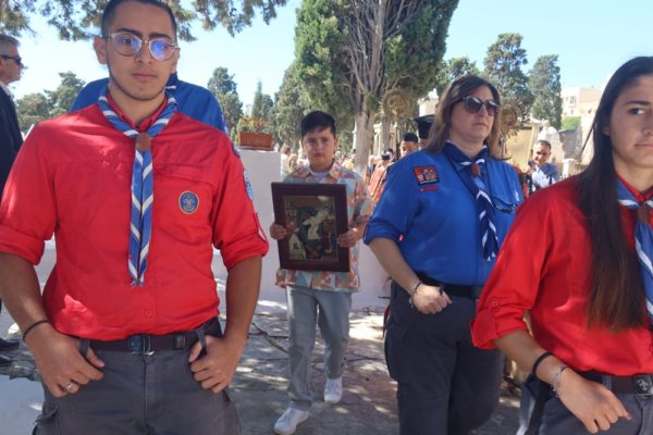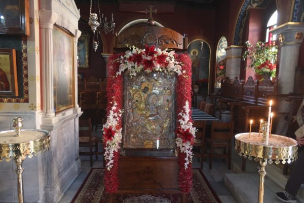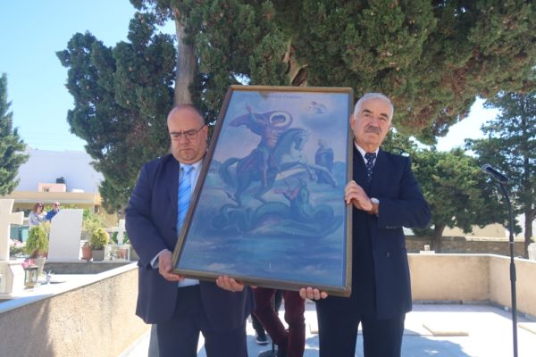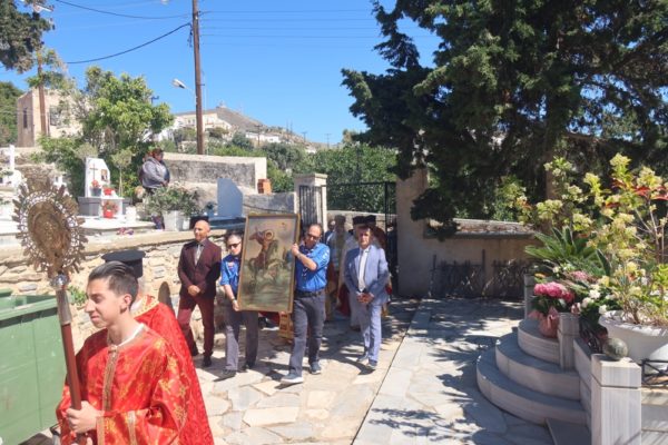 Μετά το πέρας της Θείας Λειτουργίας έλαβε χώρα λιτανεία της θαυματουργού Εικόνος του Αγίου Γεωργίου, στο παρακείμενο του Ναού Κοιμητήριο, ενώ η Φιλαρμονική του Δήμου Σύρου-Ερμούπολης παιάνιζε εόρτια εμβατήρια.