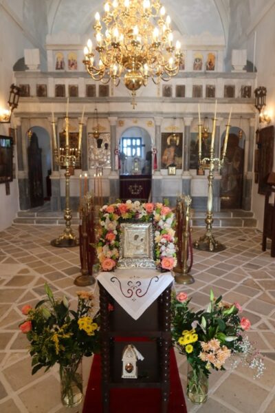 Αμέσως μετά την άφιξη του, η ιερά Εικόνα της Παναγίας μεταφέρθηκε λιτανευτικώς από την οικία του Πανηγυρά στον μοναδικής αρχιτεκτονικής περικαλλή Ιερό Ναό της Παναγίας, στην περιοχή «Παλαιόκαστρο», όπου και ετελέσθη Αρχιερατικός Εσπερινός, προεξάρχοντος του Σεβασμιωτάτου κ. Δωροθέου Β’, με τη συμμετοχή των δύο Εφημερίων του νησιού των ευσεβών κατοίκων του.