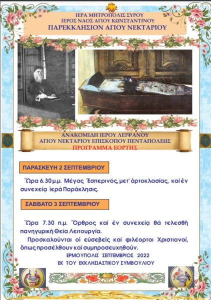 Την ανακομιδή του Ιερού Λειψάνου του Αγίου Νεκταρίου θα εορτάσει η Ιερά Μητρόπολη Σύρου στο φερώνυμο παρεκκλήσι του Ιερού Ναού του Αγίου Κωνσταντίνου.