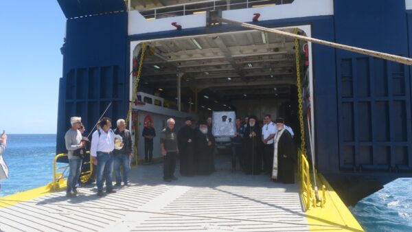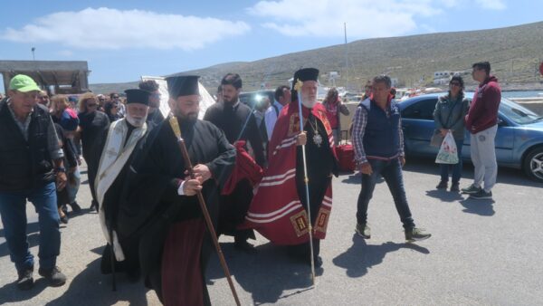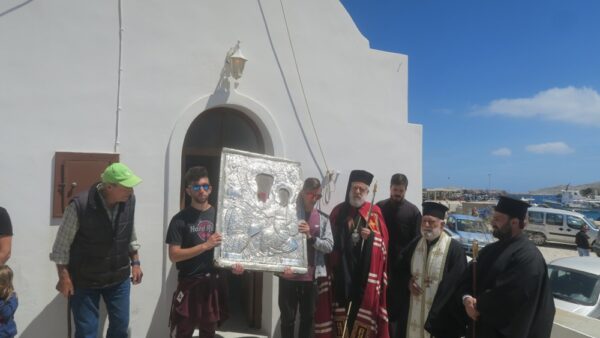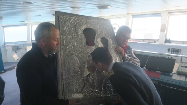 Αμεσως μετά την άφιξη του Σεβασμιωτάτου κ. Δωροθέου Β’ το μεσημέρι στη Φολέγανδρο, στην προβλήτα του μικρού λιμανιού του νησιού η Εικόνα της Παναγίας της επιλεγομένης «Μαγιάτισσας», η οποία επί διήμερον «φιλοξενείται» από όλα τα σπίτια της Φολεγάνδρου, «επιβιβάσθηκε» στο πλοίο «Aqua Jewel”, περιήλθε όλους τους χώρους του και κατέληξε στη γέφυρα του πλοίου, όπου την κατησπάσθη συγκινημένος ο Ερμουπολίτης Πλοίαρχος κ. Πέτρος Ψωμάς και όλο το πλήρωμα.