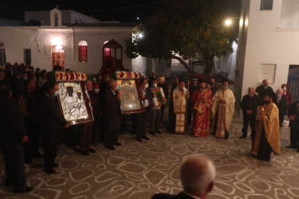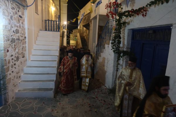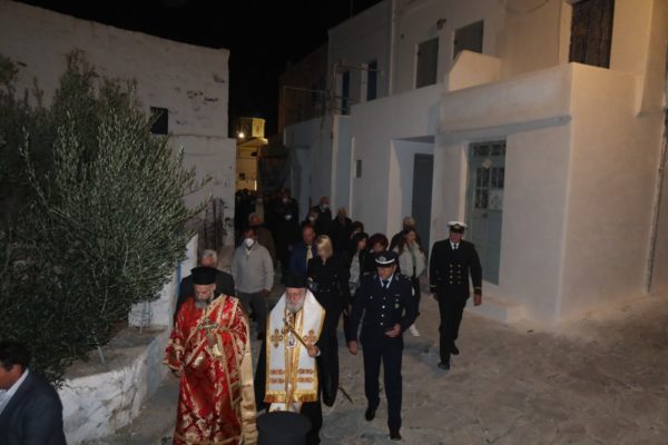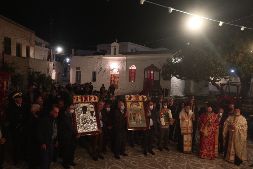 Μετά το πέρας της Ακολουθίας, έγινε η κατά το έθος λιτάνευση των ιερών Εικόνων της Παναγίας Οδηγητρίας, των Εισοδίων και της Οσίας Μεθοδίας στους καθαρούς και περιποιημένους δρόμους της Κιμώλου.