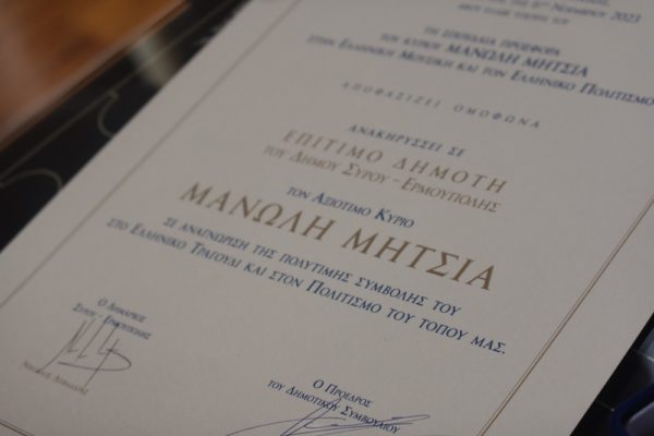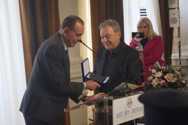 Ο Δήμαρχος Σύρου-Ερμούπολης κ. Νικόλαος Λειβαδάρας ανεφέρθη στην πολυετή και επιτυχημένη επαγγελματική πορεία του διεθνώς πλέον καταξιωμένου Καλλιτέχνη κ. Μανώλη Μητσιά, ειπών μεταξύ άλλων, “Με μεγάλη χαρά βρισκόμαστε σήμερα εδώ, στην Αίθουσα Συνεδριάσεων του Δημοτικού Συμβουλίου του ιστορικού Δημαρχείου μας, για να τιμήσουμε έναν σπουδαίο καλλιτέχνη και ερμηνευτή αναγνωρισμένο παγκοσμίως, έναν άνθρωπο με εξαιρετικό ήθος και παιδεία, που έχει σημαδέψει το ελληνικό τραγούδι με τη μαγευτική φωνή του και τις ανεπανάληπτες ερμηνείες του, τον Μανώλη Μητσιά», υπογραμμίζοντας ότι ο κ. Μητσιάς, έχοντας διανύσει μια σπουδαία πορεία ζωής με συνέπεια, αξιοπρέπεια και ποιότητα, είναι ένας καλλιτέχνης που τίμησε και τιμά το ελληνικό τραγούδι τόσο με τη στάση και τις επιλογές του όσο και με τις ερμηνείες του, τονίζοντας ότι «Δεν υπάρχει μεγάλος συνθέτης ή στιχουργός με τον οποίο να μην έχει συνεργαστεί και δεν υπάρχει τραγούδι του που να μη μιλάει στην καρδιά μας».