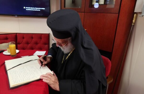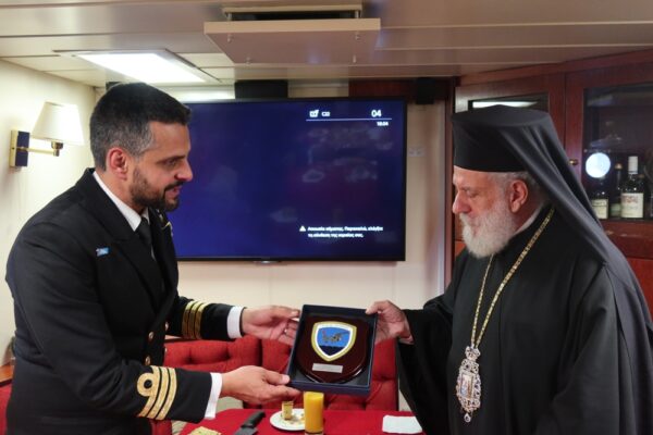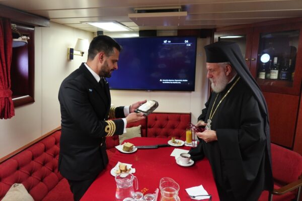 Προσέφερε επίσης αντίγραφο της Εικόνος της Μεγαλόχαρης στον Κυβερνήτη και, δι’ αυτού, αντίγραφο της Εικόνος του Αγίου Νικολάου στον Ενδοξότατο Αρχηγό του ΓΕΝ, μαζί με τις ευχές και τις ευχαριστίες του.
