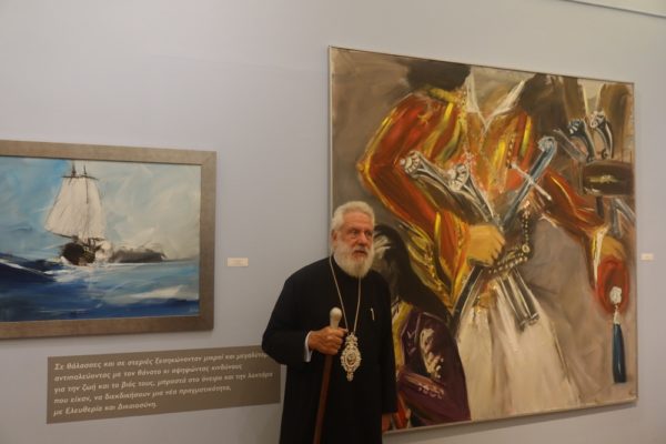 Πρόκειται για μια Έκθεση, που ξεκινάει από τον ζωγράφο Θεόφιλο για να φτάσει σε μερικούς από τους σημαντικότερους σύγχρονους Έλληνες εικαστικούς, με σημεία αναφοράς την ελευθερία, την αξιοπρέπεια και τα ανθρώπινα δικαιώματα, την οποία επιμελήθηκε η ιστορικός τέχνης και θεωρίας του Πολιτισμού στο ΕΚΠΑ κ. Αθηνά Σχινά, την οποία ο Σεβασμιώτατος κ. Δωρόθεος Β’ ιδιαιτέρως συνεχάρη.
