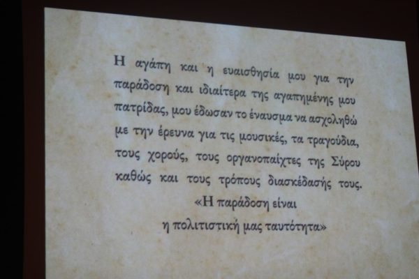 Χαιρετίζοντας την εκδήλωση, την οποία πλαισίωσε ορχήστρα και χορευτικό πρόγραμμα, ο Σεβασμιώτατος κ. Δωρόθεος Β΄ ευχαρίστησε και συνεχάρη τον κ. Νικόλαο Σολάρη, ως πατέρα, χοροδιδάσκαλο και άνθρωπο, ο οποίος διδάσκει και προβάλλει επί πεντηκονταετία την μουσική και χορευτική παράδοση της Σύρου, συντηρώντας προς τούτο και το Παραδοσιακό Εργαστήρι Σύρου ” ΑΡΩΜΑ ΠΑΡΑΔΟΣΗΣ”.