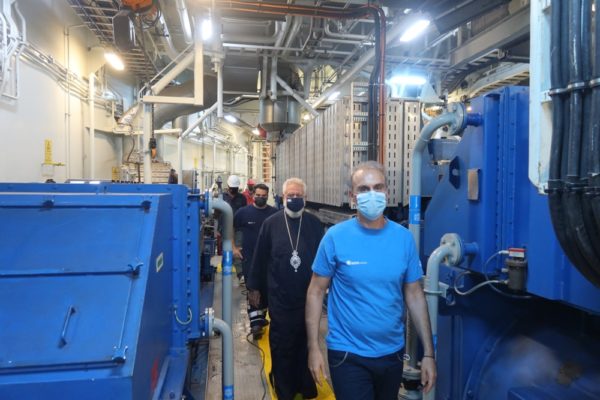 Ο Σεβασμιώτατος κ. Δωρόθεος Β΄ τους ευχαρίστησε για την υποδοχή και για την επιλογή του “ΝΕΩΡΙΟΥ’ προς επιτέλεση των εργασιών μετασκευής του πλοίου, τις οποίες εκτελούν επιτυχώς με την εγνωσμένη πείρα, εργατικότητα και αποτελεσματικότητά τους οι εργαζόμενοι του Ναυπηγείου.