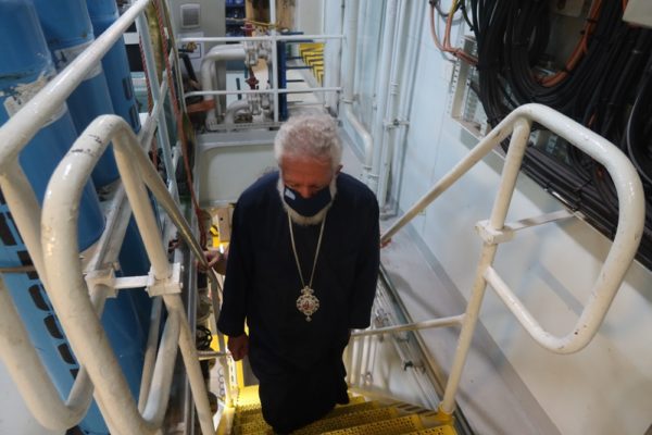 Τον Σεβασμιώτατο κ. Δωρόθεο Β΄ υπεδέχθησαν με εγκαρδιότητα ο Πλοίαρχος κ. Δημήτριος Κοκκαλιάρης, ο Υποπλοίαρχος κ. Ασλής Βλαδίμηρος, ο Μηχανικός Α’ Ζώας Μιχαήλ και ο επιβλέπων ναυπηγός κ. Ευάγγελος Χαλκιάς, οι οποίοι τον ξενάγησαν στους χώρους του και του εξήγησαν την σπουδαιότητα της αποστολής του.