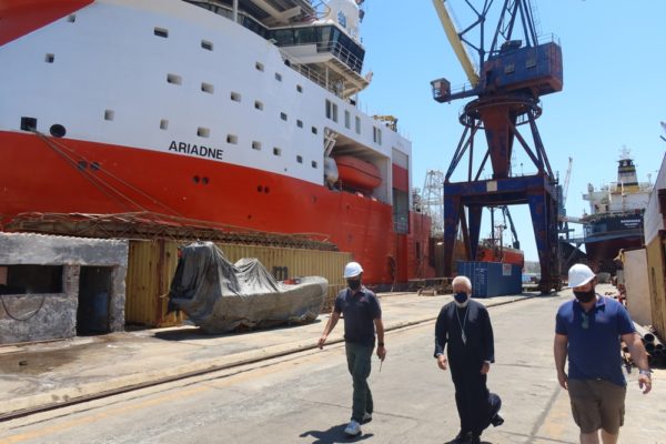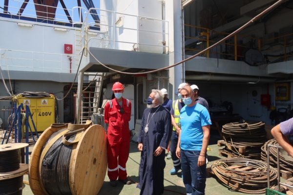 Το πλοίο “ΑΡΙΑΔΝΗ” της Εταιρείας Asso.subsea, ελληνικών συμφερόντων, με έδρα την Ελευσίνα, που ασχολείται με υποβρύχιες εργασίες και έχει εξειδικευτεί στα υποβρύχια καλώδια, παρέχει ολοκληρωμένες εργασίες χαρτογράφησης βυθού, πόντισης, προστασίας, επιθεωρήσεων και επισκευών καλωδίων ηλεκτρικού ρεύματος και οπτικών ινών, το οποίο από τις 24.12.2020 πραγματοποιεί εκτεταμένες εργασίες μετασκευής του από πλοίο πολλαπλών χρήσεων, σε εξειδικευμένο καλωδιακό, επεσκέφθη σήμερα ο Σεβασμιώτατος κ. Δωρόθεος Β΄, συνοδευόμενος από τον Πρόεδρο του Εργοστασιακού Σωματείου του Ναυπηγείου κ. Αντ. Χατζαντώνη και τον Ταμία κ. Αρτέμιο Βενιέρη.