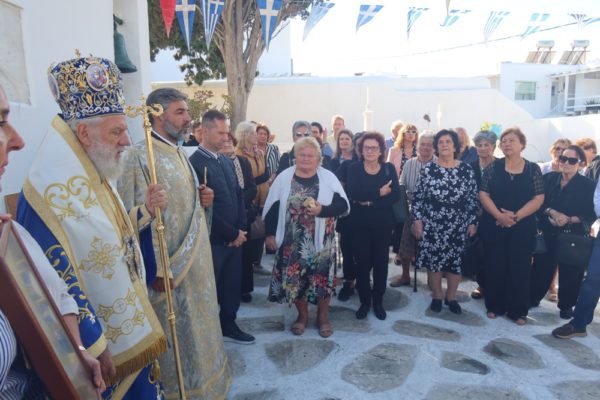 Ο Σεβασμιώτατος συμπαραστάθηκε από τον Εφημέριο του Ναού και Αρχιερατικό Επίτροπο Μυκόνου Πρωτοπρ. Πέτρο Μαραγκό και τους Διακόνους του.