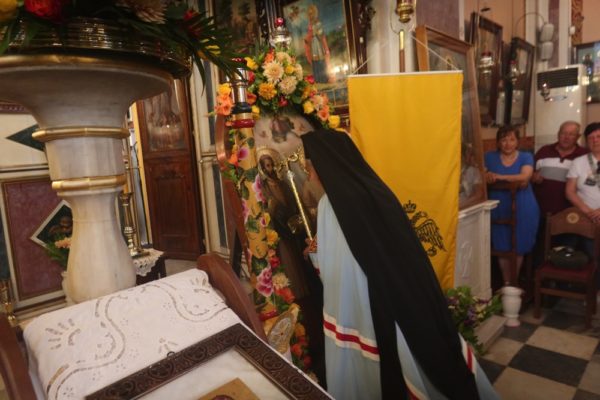 Ακολούθησε μικρά λιτανεία της Ιεράς Εικόνος των Αγίων πέριξ του Ναού, προ του πέρατος της οποίας ο Σεβασμιώτατος Μητροπολίτης Σύρου κ. Δωρόθεος Β’ ευχήθηκε στους πιστούς για τον ανατέλλοντα αύριο νέο μήνα Ιούλιο.