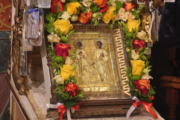 Προέτρεψε, επίσης, τους πιστούς να μιμηθούν τις αρετές των σήμερα τιμωμένων Αγίων και ιδιαίτερα την απροϋπόθετη αγάπη τους προς το Θεό και τον συνάνθρωπο, τονίζοντας ότι σήμερα οι άνθρωποι δεν έχουν τόσο ανάγκη από φάρμακα, όσο από ένα απαλό χάδι, ένα παρηγορητικό λόγο, ένα επιστηρικτικό χαμόγελο, που θα τους βοηθήσει να ανταπεξέλθουν στις δυσκολίες, τα προβλήματα και τις αντιξοότητες της ζωής.