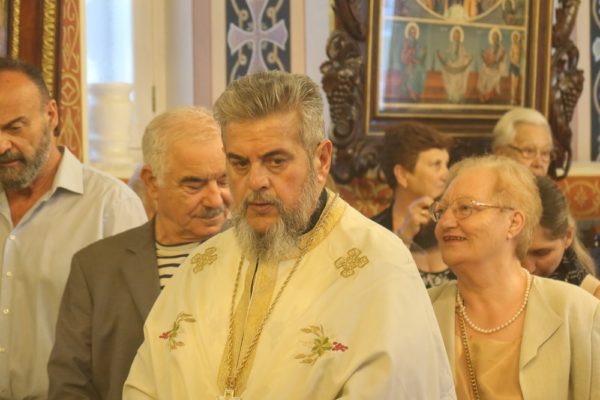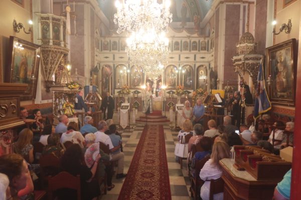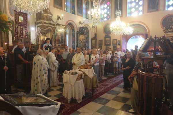 Ο Σεβασμιώτατος πλαισιώθηκε από τον Εφημέριο του Ναού και Εφημερίους Ενοριών της Σύρου, με την παρουσία του Θεματικού Αντιπεριφερειάρχη Μεταφορών Κυκλάδων κ. Μ. Δαδάου, του Αντιδημάρχου κ. Δημ. Κοσμά, και πολλών φιλαγίων προσκυνητών.