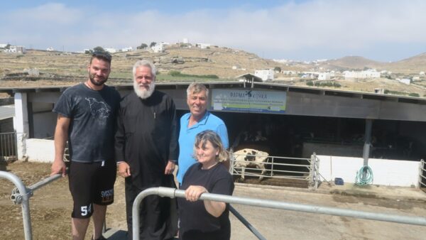 Ακολούθως, ο Σεβασμιώτατος κ. Δωρόθεος Β΄ επεσκέφθη την πρότυπη αγελαδοτροφική φάρμα του κ. Κουκά, τον οποίο και συνεχάρη για την επιτυχή επιχειρηματική του δραστηριότητα, τα προϊόντα της οποίας επεκτείνονται και εκτός Μυκόνου.