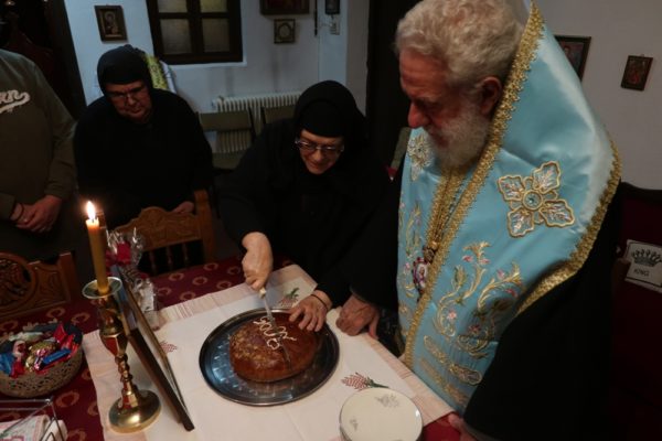 Στη συνέχεια, ο Σεβασμιώτατος επισκέφθηκε την Γυναικεία Ιερά Μονή Ζωοδόχου Πηγής Μπατσίου, όπου ευλόγησε την πίτα του Αγίου Βασιλείου και ευχήθηκε στις εκεί εγκαταβιούσες Μοναχές.