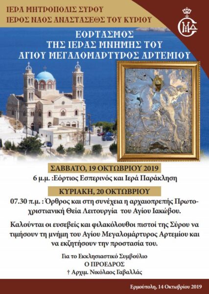 Ιερά Μητρόπολις Σύρου – Ιερός Ναός Αναστάσεως του Κυρίου – Εορτασμός της Ιεράς Μνήμης του Αγίου Μεγαλομάρτυρος Αρτεμίου θα λάβει χώρα κατά το Σάββατο – Κυριακή 19/20 Οκτωβρίου 2019. Την Κυριακή, το πρωί, θα τελεσθεί η αρχαιοπρεπής Πρωτοχριστιανική Θεία Λειτουργία του Αγίου Ιακώβου.