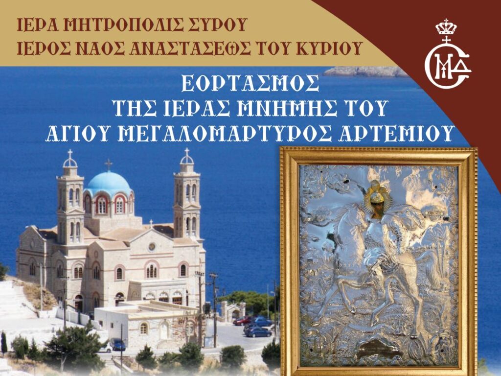 Ιερά Μητρόπολις Σύρου – Ιερός Ναός Αναστάσεως του Κυρίου – Εορτασμός της Ιεράς Μνήμης του Αγίου Μεγαλομάρτυρος Αρτεμίου θα λάβει χώρα κατά το Σάββατο – Κυριακή 19/20 Οκτωβρίου 2019. Την Κυριακή, το πρωί, θα τελεσθεί η αρχαιοπρεπής Πρωτοχριστιανική Θεία Λειτουργία του Αγίου Ιακώβου.