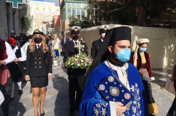 Μετά την τελετή του Μεγάλου Αγιασμού, εγένετο λιτή λιτάνευση και με τήρηση των υγειονομικών πρωτοκόλλων, του ευπρεπισμένου με άνθη δίσκου με τον Τίμιο Σταυρό, φερομένου επί των χειρών ανδρών του Λιμενικού Σώματος, της φιλαρμονικής του Δήμου Σύρου-Ερμούπολης, παιανιζούσης εμβατήρια, η οποία κατευθύνθηκε προς την αποβάθρα έμπροσθεν του μνημείου Εθνικής Αντίστασης, του λιμένα Ερμούπολης.