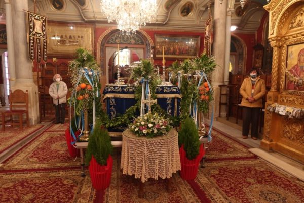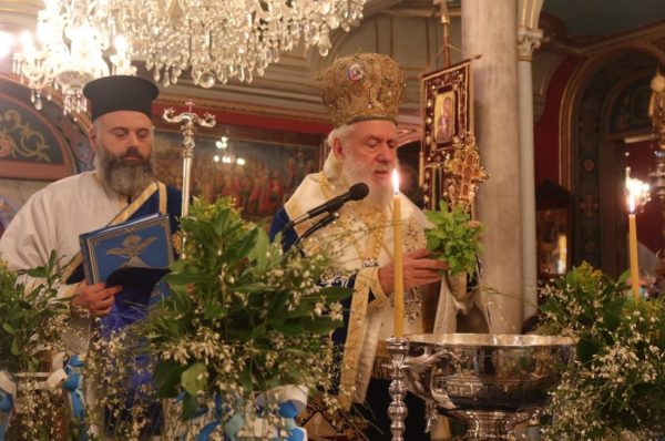 Εκεί, ο Σεβασμιωτατος, επιβαίνων σκάφους του Λιμενικού Σώματος, από την πλώρη, μαζί με την εκπρόσωπο της Κυβερνήσεως, αφού απηύθυνε προς το συγκεντρωμένο πλήθος των Συριανών σύντομη χαιρετιστήρια και ευχετήρια προσλαλιά, ευχηθείς “όπως είναι σήμερα η ημέρα αυτή φωτόλουστη και ολοφώτεινη, ζεσταίνοντας τις καρδιές μας μέσα στην καρδιά του χειμώνα, έτσι να φωτιστεί και η πατρίδα μας και να λυτρωθεί από κάθε κίνδυνο και κάθε φονικό ιό», έρριψε το Σταυρό στη θάλασσα, τον οποίο έσπευσαν να ανασύρουν τολμηροί νέοι, η δε εκπρόσωπος της Κυβέρνησης κα Χριστιάννα Καλογήρου άφησε να πετάξει συμβολικά ένα περιστέρι, ευχηθείσα «Ειρήνη στο Αιγαίο».