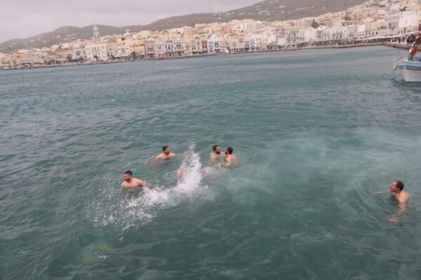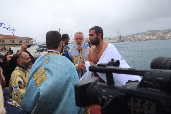 Εκεί ο Σεβασμιωτατος κ. Δωρόθεος Β’ , μετά από σύντομη τελετή έρριψε το Σταυρό στη θάλασσα, τον οποίο έσπευσαν να ανασύρουν 10 τολμηροί νέοι, υπο τα χειροκροτήματα των παρισταμένων, τους πανηγυρικούς συριγμούς των πλοίων «ΑΡΤΕΜΙΣ», «ANDROS JET», και ΤΠΚ «ΡΙΤΣΟΣ», του «BLUE STAR RODOS» και των άλλων πλοίων που δεξαμενίζονται στο Ναυπηγείο του «ΝΕΩΡΙΟΥ», των σκαφών του Λ.Σ. και του καϊκιού ενός τολμηρού ψαρά, η παρουσία του οποίου στόλισε το χώρο της τελετής, και τις χαρμόσυνες κωδωνοκρουσίες των Ναών της πόλης.