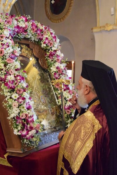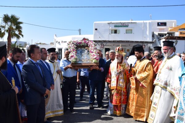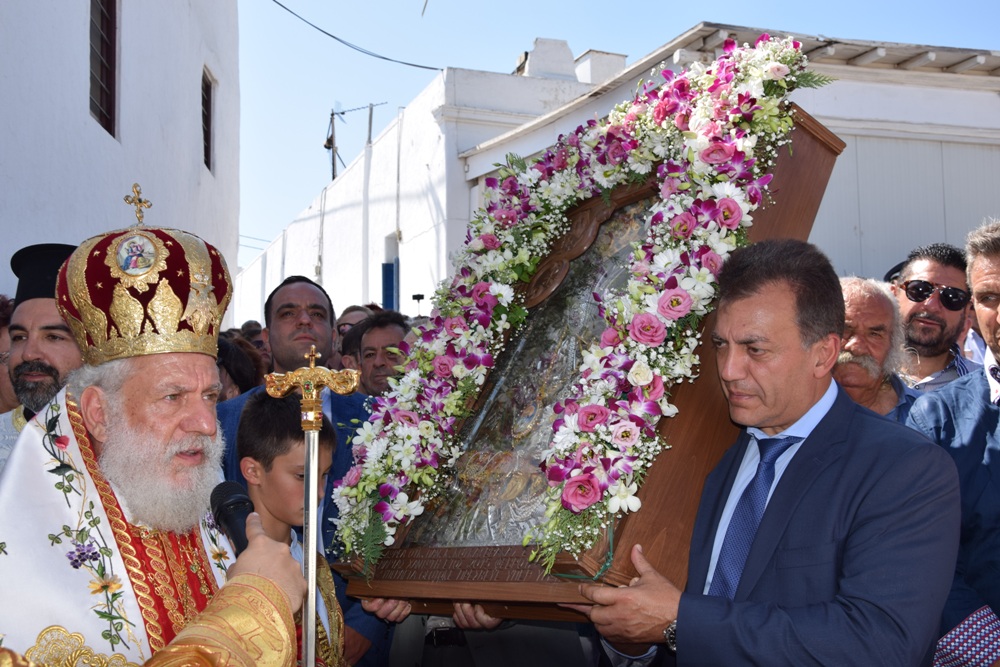 Ευχαρίστησε τη Θεοτόκο για όλες τις προς την Ελλάδα, την Ιερά Μονή και τον κάθε άνθρωπο ξεχωριστά ευεργεσίες Της, συνεχάρη τους Εφημερίους της Μυκόνου και τον προεστώτα της Μονής για το πνευματικό και ποιμαντικό έργο τους, ανεμνήσθη των επ’ εσχάτων κεκοιμημένων Ανωμεριτών, ευχήθηκε στον παριστάμενο Υπουργό Εργασίας κ. Ιω. Βρούτση καλή επιτυχία στο ευθυνοφόρο έργο του, επ’ αγαθώ του Ελληνικού λαού, ο οποιος σέβεται και τιμά τις διαχρονικές αξιες, τα εθνικά ιδανικά και τις πατρώες παραδόσεις του, ευχήθηκε δημιουργική θητεία στους νεοεκλεγέντες άρχοντες της Τοπικής Αυτοδιοίκησης και εφ’ όλους τους παρισταμένους επεκαλέσθη την ευλογία της Παναγίας.