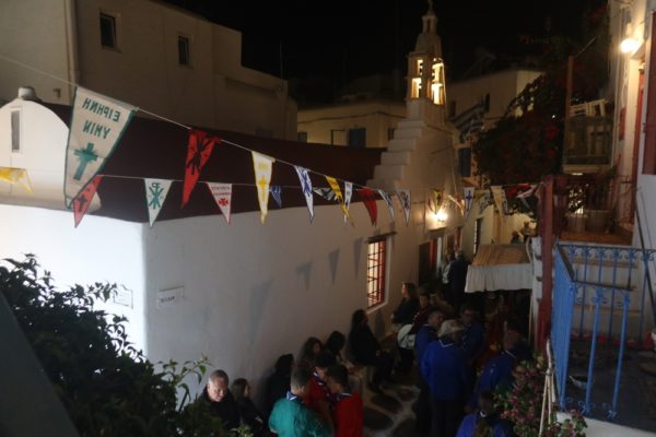 Μέγα πλήθος Μυκονίων πιστών κατέκλυσε απόψε τον Ιερό Ναό του Οσίου Γερασίμου και τον αύλιο χώρο του στη Χώρα της Μυκόνου.
