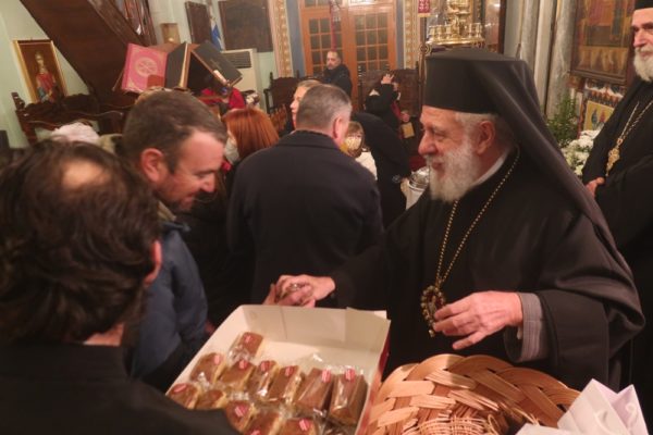Προ του πέρατος της Ακολουθίας, τους Ύμνους της οποίας απέδωσε η Βυζαντινή Χορωδία «Αντιφωνικό Μέλος», υπό τη διεύθυνση του κ. Γ. Καμαριάρη, ο Σεβασμιώτατος κ. Δωρόθεος Β’ ευλόγησε την πίτα του Αγίου Βασιλείου, την οποία διένειμε με δώρα στους πιστούς και παιχνίδια στα παιδιά.