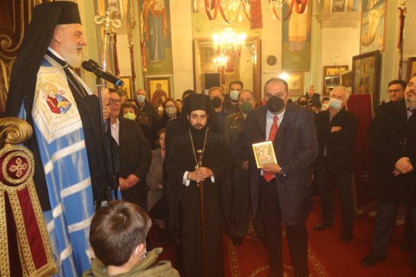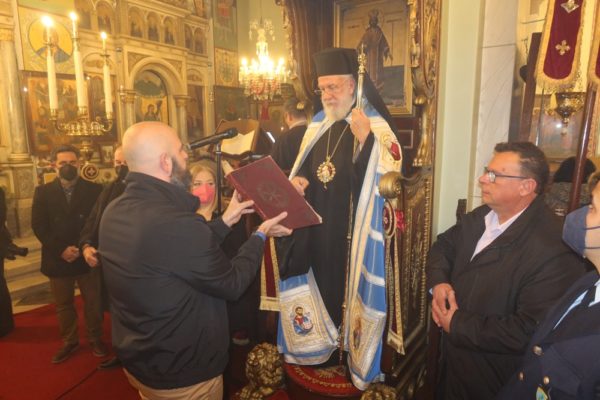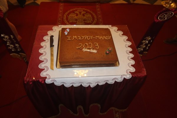 Τέλος, ο Εφημέριος του Ναού, Αρχιμ. Νεκτάριος Σώρρος, προσέφερε στον Διευθυντή της Εταιρείας της Εταιρείας «IMERIS» Μήλου κ. Σανούδο, εικόνα του Αγίου Νικολάου, ευχαριστώντας τον για τις πολλές ευεργεσίες της Εταιρείας προς τον Ιερό Ναό και την Ιερά Μητρόπολη.