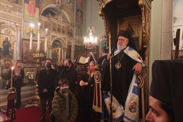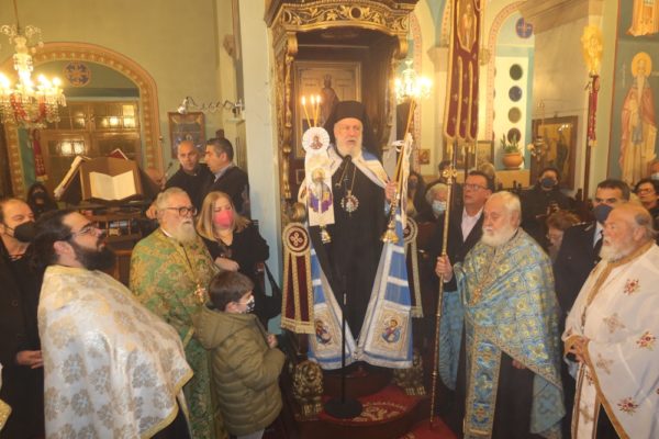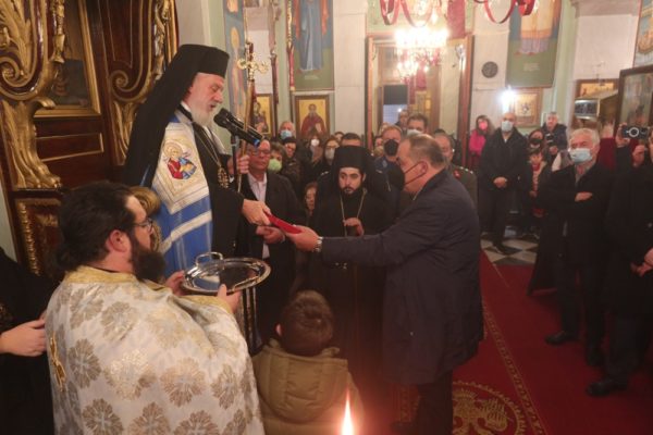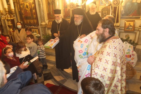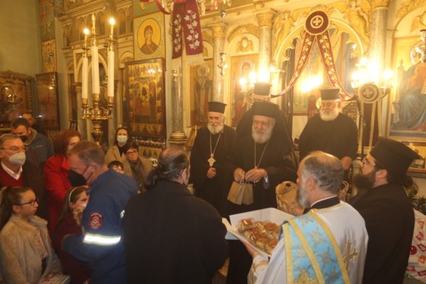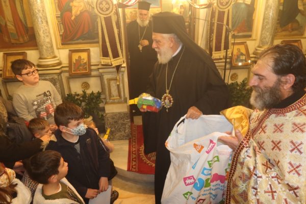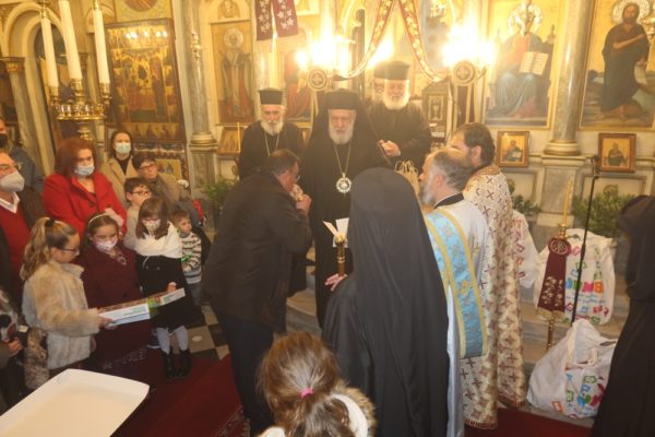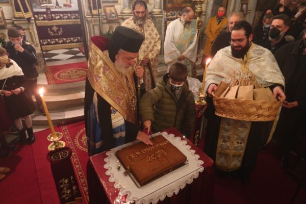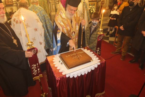 Προ του πέρατος της Ακολουθίας, τους Ύμνους της οποίας απέδωσε η Βυζαντινή Χορωδία «Αντιφωνικό Μέλος», υπό τη διεύθυνση του κ. Γ. Καμαριάρη, ο Σεβασμιώτατος κ. Δωρόθεος Β’ ευλόγησε την πίτα του Αγίου Βασιλείου, την οποία διένειμε με δώρα στους πιστούς και παιχνίδια στα παιδιά.
