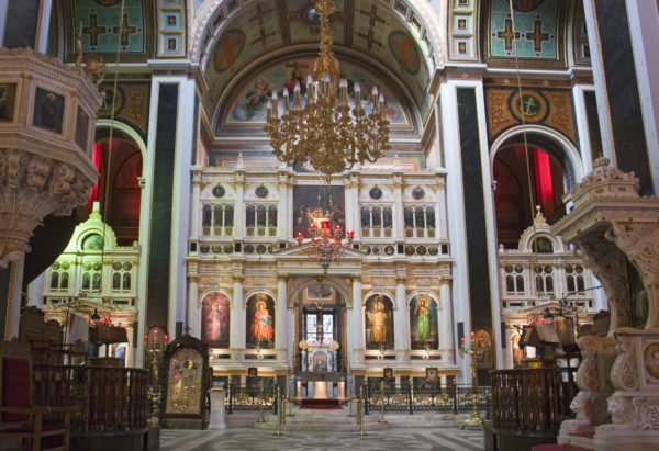 Εσωτερικά, τοξοστοιχίες σε πεσσούς χωρίζουν τον ναό σε τρία κλίτη και γυναικωνίτης περιτρέχει τις τρεις πλευρές του. Κυριαρχεί το μάρμαρο, που προσδίδει ξεχωριστή αίγλη στον ναό: μαρμάρινοι κορινθιακοί κίονες, υπέρθυρα με ανάγλυφες φυτικές διακοσμήσεις, πλακόστρωση σε χρώμα γκρι – γαλάζιο. Το μαρμάρινο τέμπλο έγινε μετά από πανελλήνιο διαγωνισμό που προκήρυξε ο Δήμος το 1871. Δεν γνωρίζουμε τον σχεδιαστή, κατασκευάστηκε όμως από τον γλύπτη Γεώργιο Βιτάλη το διάστημα 1883-1899.