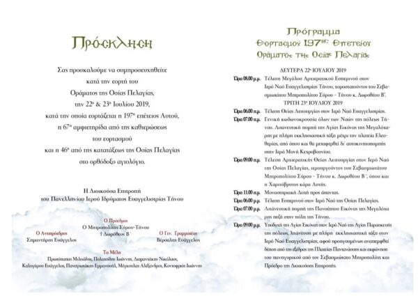 Πρόγραμμα Εορτασμού 197ης Επετείου Οράματος της Οσίας Πελαγίας, καθώς αυτό παρατίθεται εκ της ιστοσελίδος της Ιεράς Μητροπόλεως Σύρου ΕΔΩ