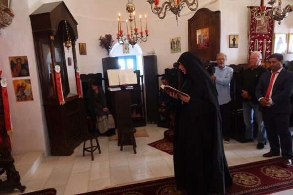 Άμα τη αφίξει της τελέσθηκε στο Καθολικό της Μονής Αρχιερατική Θεία Λειτουργία, ιερουργούντος του Σεβασμιωτάτου κ. Δωροθέου Β’, συμπαρατατουμένου από τους δύο Εφημερίους της νήσου, με την Υπεύθυνη της Μονής, Μοναχή Δωροθέα να διακονεί το Αναλόγιο, και με την παρουσία του Δημάρχου Σικίνου κ. Βασιλείου Μαράκη, Δημοτικών Συμβούλων, Εκπαιδευτικών και πολλων Σικινίων πιστών, οι οποίοι προσήλθαν με τα παιδιά τους, τηρούντες τα υποδειχθέντα μέτρα υγειονομικής προστασίας.