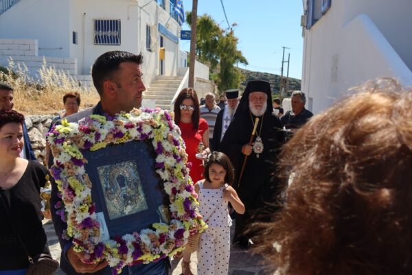 Τέλος, αναφέρθηκε στις ευεργεσίες της Θεοτόκου, τις οποίες ως ακένωτος πηγή διαχέει προς την ανθρωπότητα, ευχαρίστησε τους δυο Εφημερίους της Σικίνου, Πρωτοπρεσβυτέρους Σπυρίδωνα και Θεόδωρο, για τη διακονία τους, και την Υπεύθυνη της Ιεράς Μονής, Μοναχή Δωροθέα για την άοκνη μέριμνά της, και τους πιστούς για την παρουσία τους, προς τους οποίους διένειμε μαζί με το αντίδωρο εικόνες της Αναστάσεως, ως ευλογία, και παιχνίδια στα παιδιά.