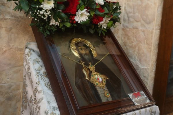 Κατέθεσε δε στο Ναό, ως ευλογία, το ” Σχήμα” του Οσίου, το οποίο του προσέφερε κατά την προ διετίας συμμετοχή του στην Πανήγυρι της Ιεράς Μονής Οσίου Παταπίου Λουτρακίου ο Σεβασμιώτατος Μητροπολίτης Κορίνθου κ. Διονύσιος, λέγων ότι κατά τη διδασκαλία των Πατέρων η άκτιστη χάρι του Θεού αγιάζει όχι μόνο τις ψυχές, αλλά και τα σώματα των Αγίων, ακόμη και ιερά αντικείμενα, όπως εικόνες και τάφους ιερών προσώπων, και επικαλούμενος και τη μαρτυρία του Αγίου Ιωάννου του Χρυσοστόμου, ότι ” όχι τα οστά μόνον των Μαρτύρων, αλλά και οι τάφοι αυτών και αι λάρνακες πολλήν αναβλύζουν ευλογίαν”.