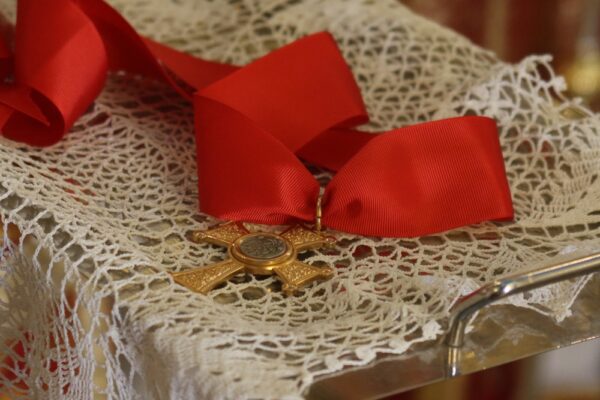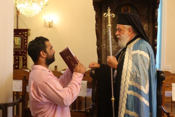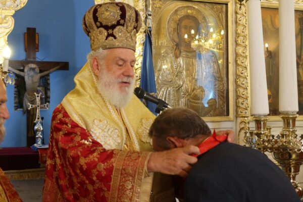 Προ του πέρατος της Θείας Λειτουργίας τίμησε με το παράσημο της Ιεράς Μητροπόλεως τον Ιεροψάλτη του Ναού κ. Ιωάννη Χαλά, ο οποίος, καίτοι αυτοδίδακτος, επί δεκαετίες περικοσμεί και διακονεί ανιδιοτελώς με αφοσίωση το Αναλόγιο του Ναού.