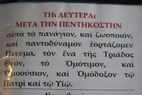 Κηρύσσων τον θείο λόγο, ο Σεβασμιώτατος κ. Δωρόθεος Β’ αναφέρθηκε στην παρουσία του Αγίου Πνεύματος στη ζωή της Εκκλησίας και των πιστών και στις Δωρεές Του με τις οποίες χαριτώνει και αγιάζει τη ζωή κάθε βαπτισμένου στο Όνομα της Αγίας Τριάδος. Υπογράμμισε, μάλιστα, ότι η ζωή των πιστών αρχίζει με την επίκληση του Τριαδικού Θεού, «εις το Όνομα του Πατρός… », κατά τον σαραντισμό και την είσοδο του ανθρώπου στην Εκκλησία, και τελειώνει με τις Δεήσεις της Εκκλησίας να συναυλίζεται αιώνια μαζί με τους Αγίους ενώπιον του ουρανίου θρόνου της Αγίας Τριάδος. Ωσαύτως εμνήσθη του ονόματος του επί δεκαετίες διακονήσαντος ευόρκως την ενορία και ήδη εφησυχάζοντος Αρχιμ. Κυπριανού Χειμώνα.