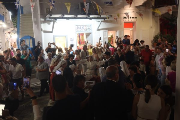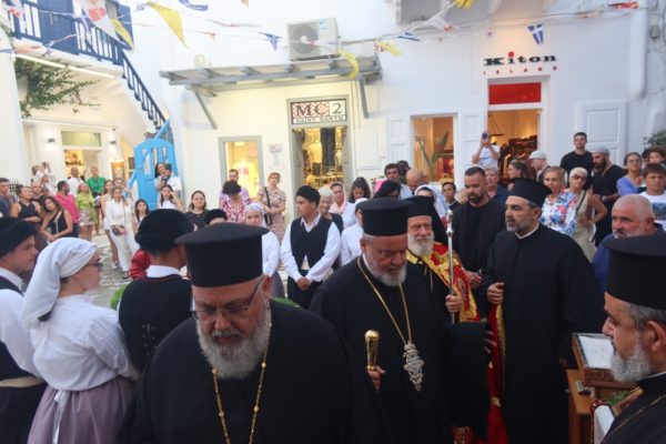 Η ακολουθία τελέστηκε με τη συμμετοχή των Εφημερίων της νήσου και την παρουσία του Δημάρχου Μυκόνου κ. Κωνστ. Κουκά, του Αντιπεριφερειάρχη Πολιτισμού κ. Στ. Πρίγκου , Αντιδημάρχων, Δημοτικών Συμβούλων, διατελεσάντων Δημάρχων, του Λιμενάρχη Μυκόνου και Αξιωματικών του Λιμενικού Σώματος, της Προέδρου της Αδελφότητος Ανωμεριτών και Μελών του Πολιτιστικού Συλλόγου «ΜΑΝΤΩ», μεταξύ των οποίων πολλά παιδιά με παραδοσιακές ενδυμασίες.