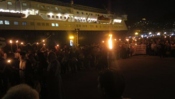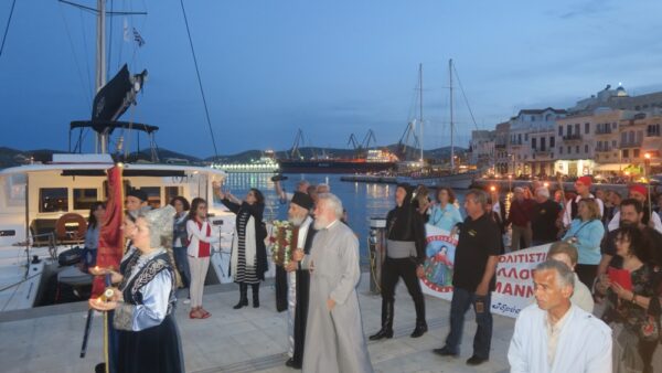 Στα πλαίσια των εκδηλώσεων μνήμης για την 100ή επέτειο από τη Γενοκτονία των Ποντίων, ο Σύλλογος Ποντίων και Βορειοελλαδιτών Σύρου διοργάνωσε λαμπαδηδρομία στον λιμένα της Ερμουπόλεως, την οποία παρακολούθησε και ο Σεβασμιώτατος κ. Δωρόθεος Β’ , ο οποίος, μαζί με τον Εφημέριο του Ιερού Ναού Κοιμήσεως της Θεοτόκου, Πρωτοπρ. Κωνστ. Κοντό, τέλεσε επιμνημόσυνη δέηση και στη συνέχεια επέβη μικρού πλοιαρίου και έρριψε, μαζί με τον Κυβερνήτη του, στέφανο στη θάλασσα, στη μνήμη των αναιρεθέντων Ελλήνων του Πόντου, ενώ το ελλιμενισμένο Πλοίο « Aqua jewel» απέδιδε τιμές.
