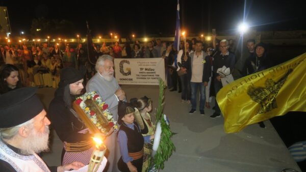 Η λαμπαδηδρομία, της οποίας προηγείτο η φυλασσομένη στα Γραφεία της Μητροπόλεως εικόνα της Παναγίας Σουμελά, διά χειρών του Προέδρου του Συλλόγου Ποντίων κ. Εμμ. Τελώνη, κατέληξε στην Πλατεία Μιαούλη, όπου επελέγη με Ποντιακά τραγούδια και τον Εθνικό Ύμνο.