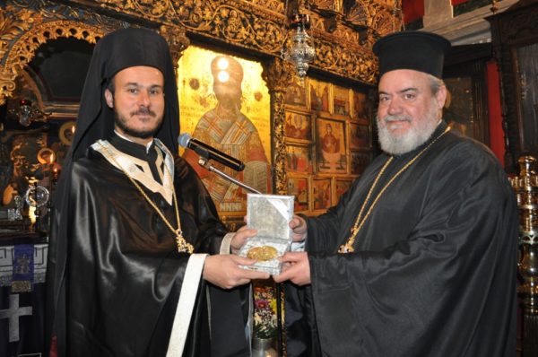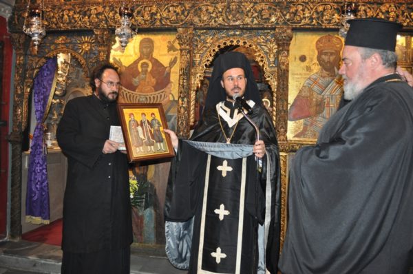 Προ της απολύσεως του Εσπερινού ο π. Γρηγόριος προσέφερε το επετειακό μετάλλιο των 200 ετών των Νεομαρτύρων στον Αρχιερατικό Επίτροπο Μυκόνου και Δήλου Πρωτοπρ. Πέτρο Μαραγκό και δώρισε στον Μητροπολιτικό Ναό, εικόνα των Τριών Σπετσιωτών προς φύλαξη και ευλογία.