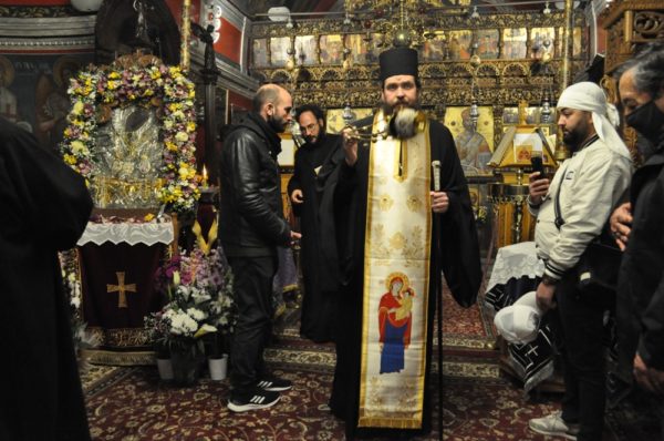 Μετά το πέρας του Κατανυκτικού Εσπερινού, ο Πανοσιολ. Καθηγούμενος της Ιεράς Μονής Τουρλιανής, Αρχιμ. Αλέξιος, τέλεσε την Παράκληση της Θεοτόκου ενώπιον της Ιεράς Εικόνος με την συμπροσευχή όλων των εφημερίων και των πιστών της νήσου.