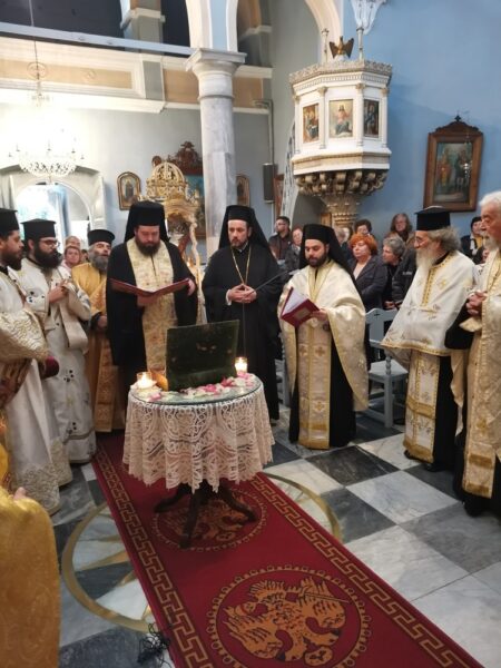 Τιμώντας, λοιπόν, τον διαχρονικό θρίαμβο της Ορθοδοξίας τιμούμε και τους πρώτους συντελεστές του, τους Αγίους Κωνσταντίνο και Ελένη, λείψανα των οποίων, που φυλάσσονται από αιώνων στο σκευοφυλάκιο της Ιεράς Μονής Θεοτόκου Τουρλιανής, όπως καταγράφεται και στον χειρόγραφο Κώδικά της του 1845, με τις ευλογίες του Σεβασμιωτάτου Ποιμενάρχου μας κ. Δωροθέου Β΄, μεταφέρθηκαν για πρώτη φορά εκτός Μονής και εκτίθενται σε προσκύνηση απόψε εδώ, στον ιερό Ναό της Αγίας Παρασκευής, και αύριο στα Ιδρύματα της Σύρου, προς ευλογία και αγιασμό των προσκυνούντων αυτά πιστών.