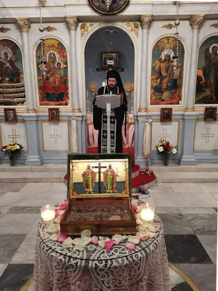 Τα ιερά λείψανα των Αγίων Θεοστέπτων Βασιλέων Κωνσταντίνου & Ελένης υποδέχτηκαν κλήρος και λαός στον αύλιο χώρου του Ιερού Ναού Αγίας Παρασκευής στην Αληθινή Σύρου. Τα λείψανα διεκόμισε από το Σκευοφυλάκειο της Ιεράς Μονής Θεοτόκου Τουρλιανής όπου φυλάσσονται ο Προεστώς της Ιεράς Μονής Θεοτόκου Τουρλιανής Πανοσιολ. Αρχιμ. Αλέξιος Παπαδόπουλος.