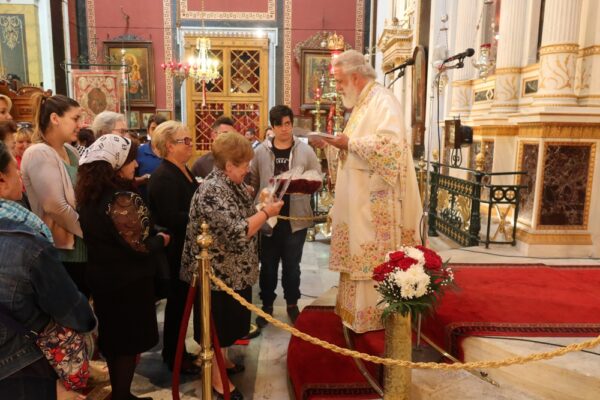 Μετά το τέλος της Θείας Λειτουργίας, μαζί με το αντίδωρο, ο Σεβασμιώτατος κ. Δωρόθεος Β’ διένειμε και εικόνες του Αγίου Δημητρίου, με το ιστορικό της Ευρέσεως.